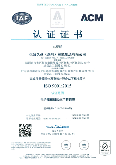 恒致久盈(深圳)智能制造有限公司已通过ISO9001:2000国际质量体系认证和ISO14001:2004卫生环境认证以及美国UL764安规线束生产认证。全部产品通过美国UL、CSA、VDE、CE、CCC等多国的产品认证,并符合欧盟ROHS和REACH环保要求,而且能满足客户的要求生产更高环保等级的产品,包括不含磷苯二甲酸盐(N6P)、PAHS、无卤等产品。